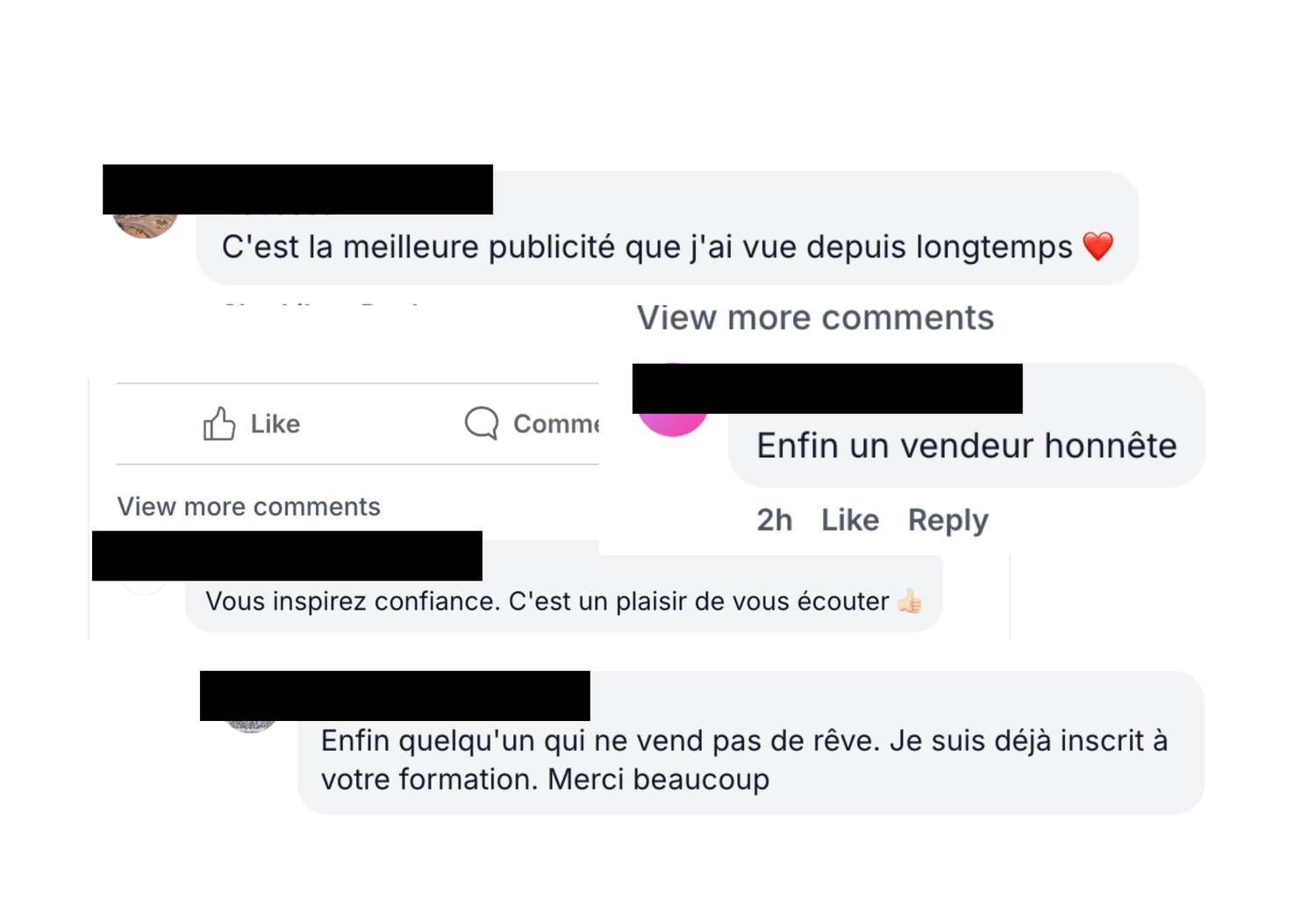 Mes clients, eux, suscitent une certaine admiration chez leurs prospects. Voici le genre de commentaires que nous avons l’habitude de recevoir sous nos publicités :